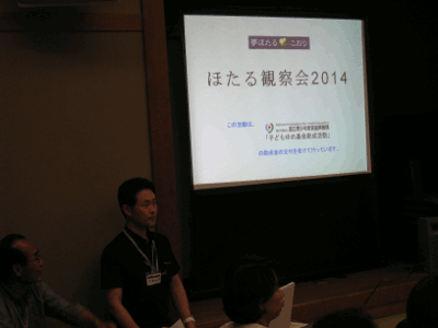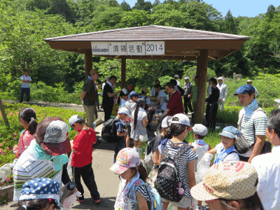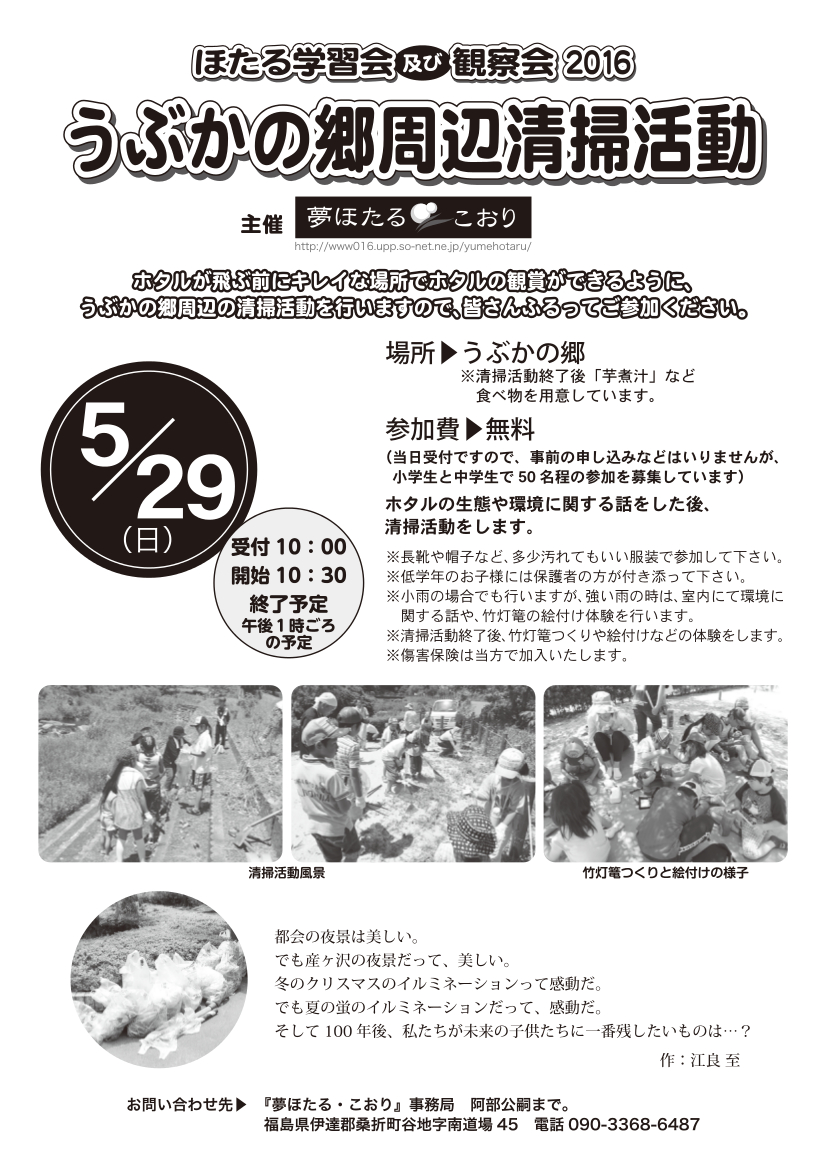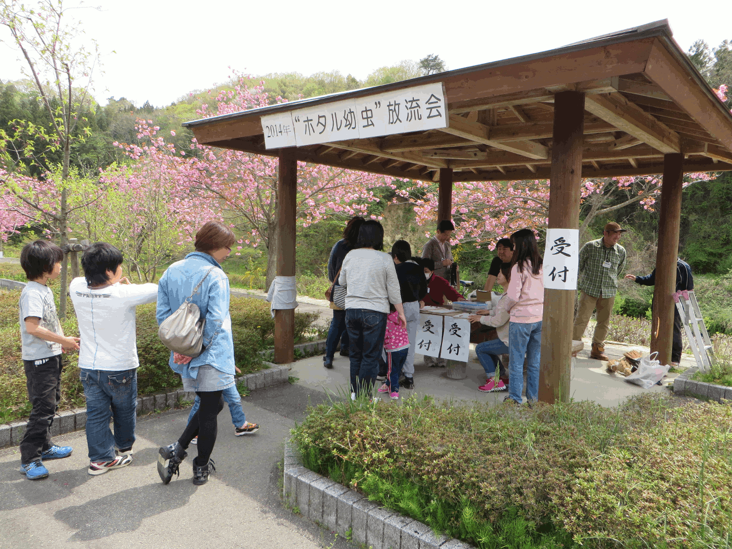 ほたる観察会2014平成26年6月28日 うぶかの郷にて開催 今回で3回目となる「ほたる観察会」を開催したところ、主に小学生の子どもたちとその保護者の方々大勢にご参加いただきました。 午後7時より室内での行事として、会長挨拶に続き事務局よりホタルの生態や不思議について話があり、参加者皆さん真剣に聞いていただきました。 また、開始までの待ち時間中には桑折町のマスコット「ホタピー」も来場してくれて、和やかに過ごすことができました。 室内での学習終了後、外に出てホタルを観察しながら事務局長からホタルの話を聞いている時に雨が降り始めてしまい、ゆっくりホタルを観察することができなくて残念でした。