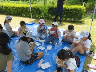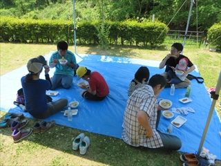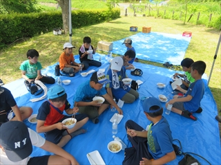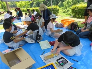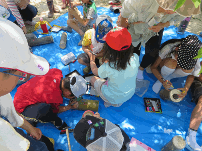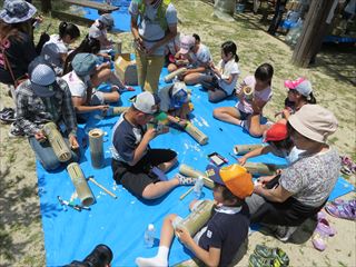 心配した雨も降らず天候に恵まれたなか、ホタルが飛び始める前に川辺の清掃活動を行いました。 町内の小・中学生40名と保護者や一般の方25名と当会のメンバー15名の総勢80名の参加をいだだきました。 毎年開催していますがゴミは年々少なくなっている様に感じています。今回はゴミ拾いよりも草むしりなどがメインの作業になりました。 清掃活動終了後には、皆で芋煮汁を食べてお腹を満たした後に、子ども達には竹灯篭の制作と絵付けをしてもらいました。竹が滑るので絵付けのペイントがうまく乗らずに垂れてしまって思い通りに描けない子もいましたが、皆上手に描いてくれました。 |