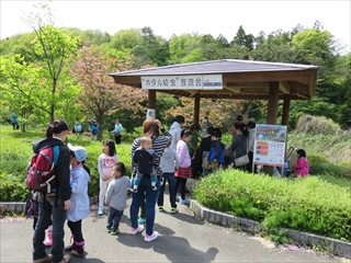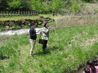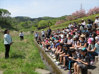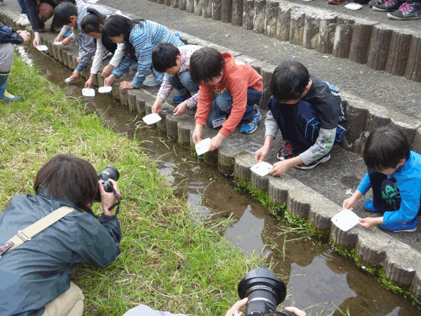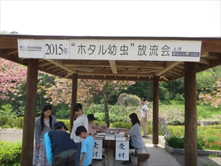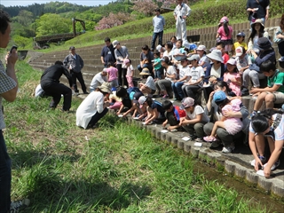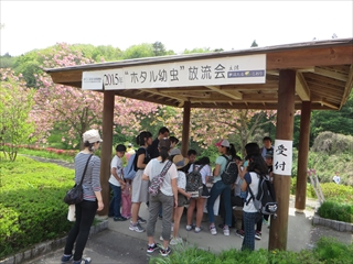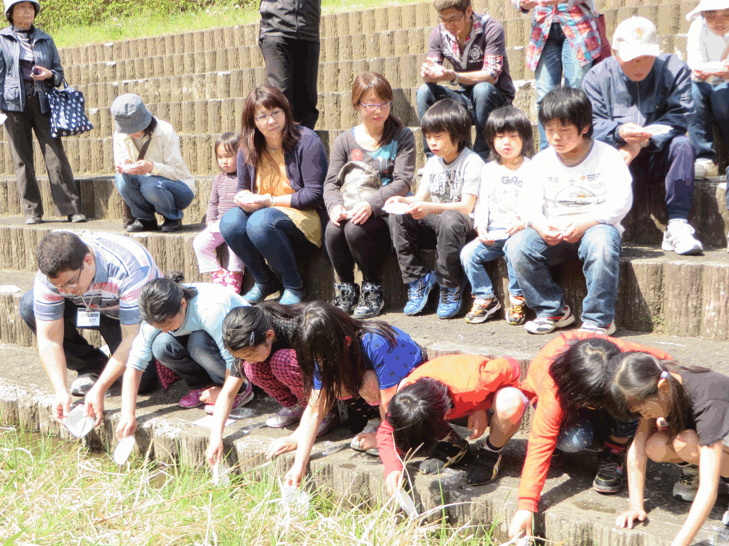 平成27年4月29日開催 晴天に恵まれ初夏を思わせるほどの暖かさのなか、幼虫放流会を開催しました。 地域の子どもたちや近隣の市や町からもたくさんの子どもたちが集まってくれました。 石幡会長の挨拶に続き、来賓の半田醸芳小学校校長の福士久子先生よりご挨拶をいただいた後、阿部事務局長よりホタルの生態のほか、この日放流した幼虫はすぐにサナギになり40日から50日たつと成虫になり飛び出すことなどの話を聞いて、少しお勉強をした後に7〜8名ずつに分かれて幼虫をそっと放流しました。