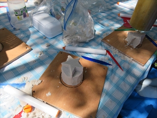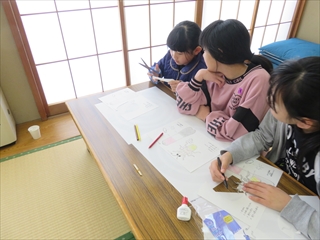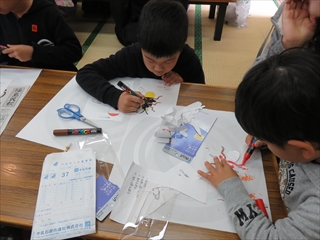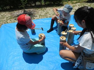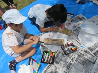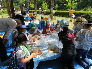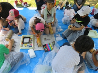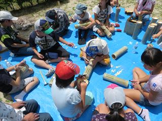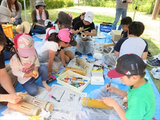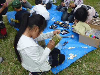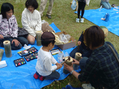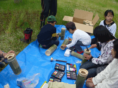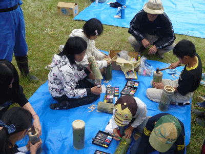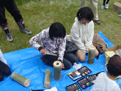 | 芋煮汁を皆で食べました。 | 竹灯篭つくりと絵付け作業 |