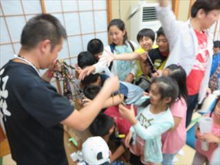午後から雨が降り、受付が始まるころには強い雨となってしまったからなのか、 参加者は予定より少なくなってしまいましたが、それでも多くの方に参加していた だけました。 初めにホタルについての話を学習して、後半に光液体を利用してのホタルの光 再現実験を体験して、おしまいには童謡「蛍」を参加者全員で合唱しまして。 外に出てホタルを観察する時間になったら、あれほど強く降っていた雨も上がり、 北の空には星も見えるくらいになり、ホタルが輝き出し子供たちが歓声を上げて喜 んでいました。 |