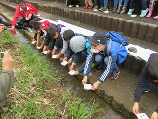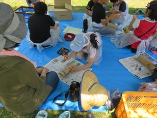 | 幼虫を受け取っているところ | 放流を整列して待ってます |