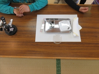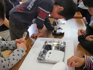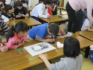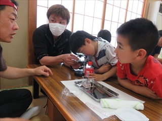| 「学習会」で、ホタルの幼虫とカワニナを観察しました。 | |